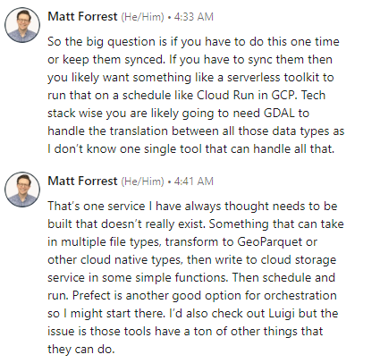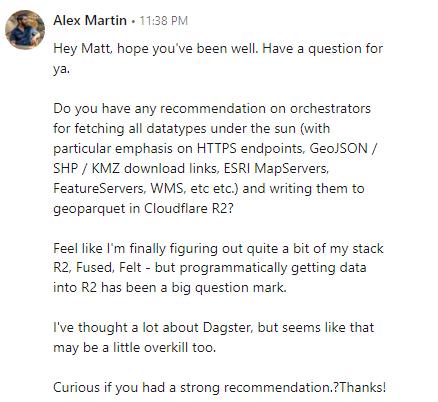 I suspected that Dagster might be the right tool for this, but it'd been over a year since I'd played with it and frankly I was a little intimidated by it. Being new to the geospatial data industry I figured there's probably a tool out there designed specifically to address this obviously common use case. Right?