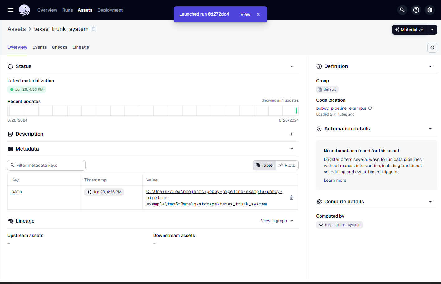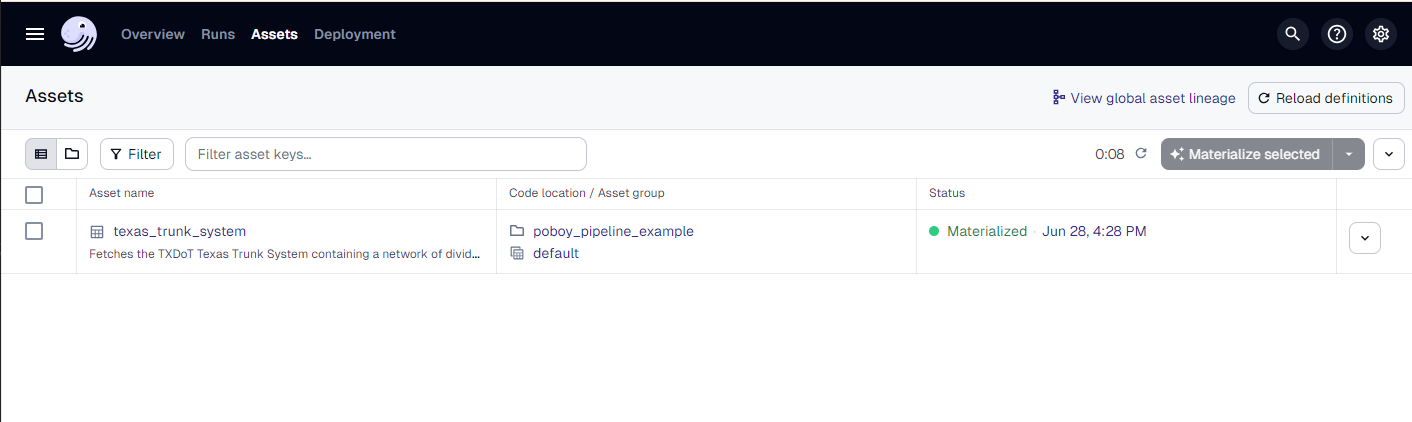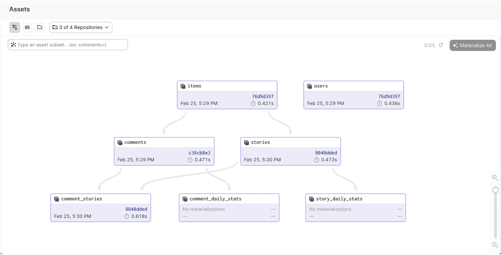 return combined_gdfWe can easily visualize all of these assets, their relationships, stats, and statuses using the handy Dagster Asset Lineage graphs.