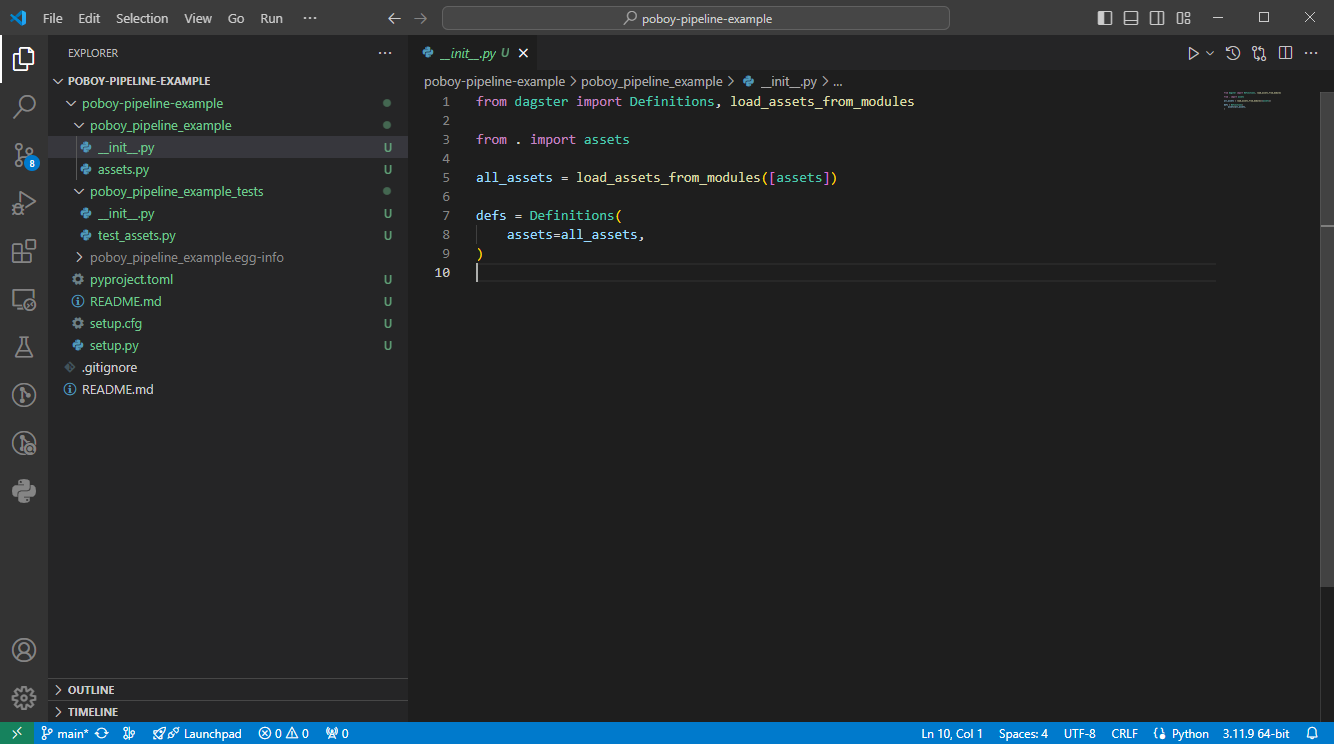 Now since we started from the scaffold our project will be pretty bare. (If you're just getting familiar with Dagster try cloning an example - you will be able to see a working pipeline implementation.)