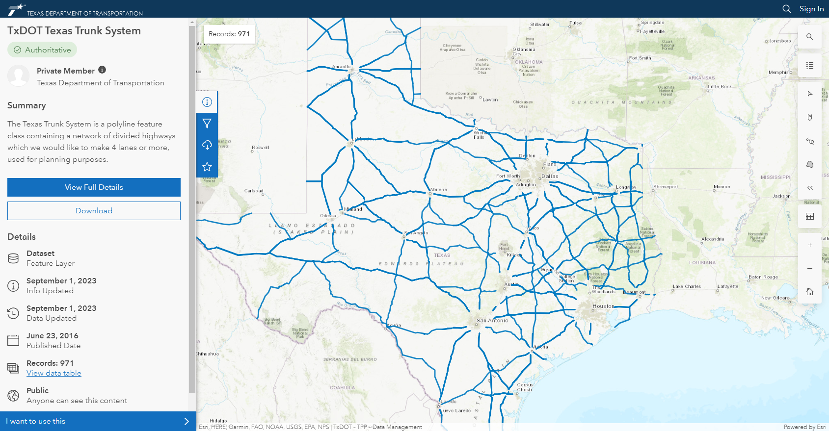 This is the Texas Department of Transportation (TXDoT) Texas Trunk System dataset. Just like the summary says - it's a dataset of the divided highways that they'd like to make 4-lanes wide or more.
