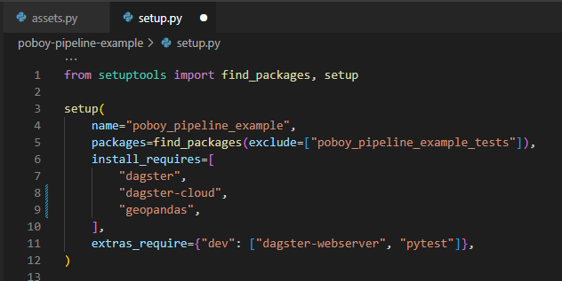 pip install geopandasThis is a good time to mention the setup.py file. Here we can specify new python dependencies like the geopandas library: