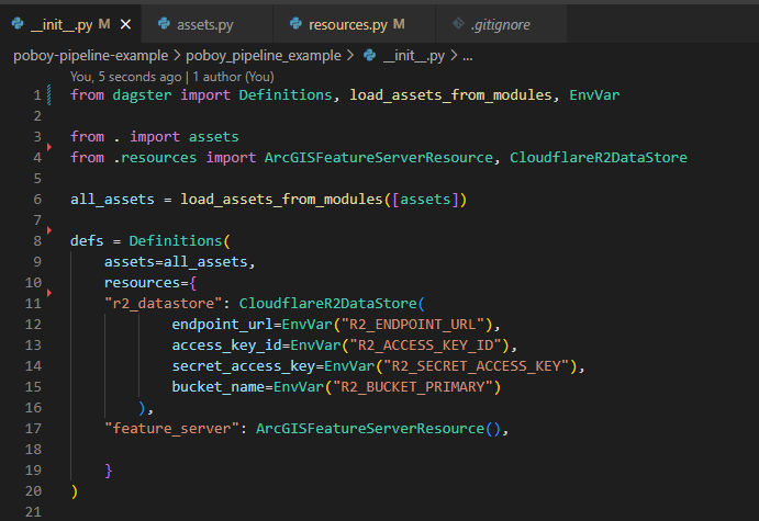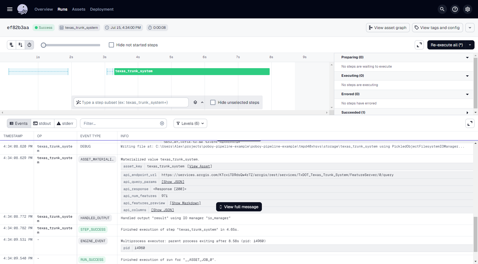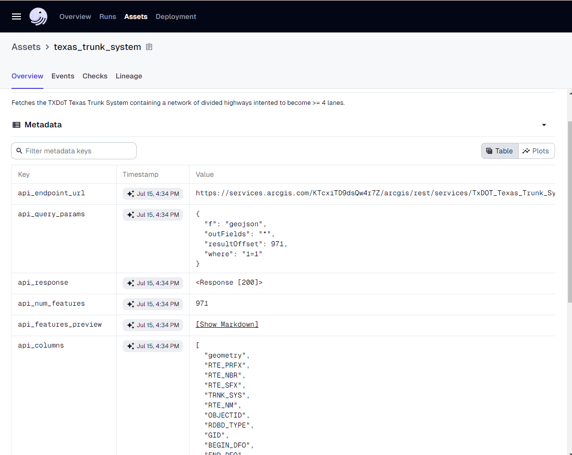 We now have a modular FeatureServer resource that we can pass to any asset to fetch data from any GeoJSON supported FeatureServer. We can apply additional business logic transformations to the asset if we like. We can write and read both partitioned and unpartitioned assets to and from R2 in GeoParquet.
