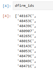 dfirm_ids_str = ", ".join([f"'{dfirm_id}'" for dfirm_id in dfirm_ids])Here I'm fetching all of the FIRM panel IDs for Texas. The result looks something like this.