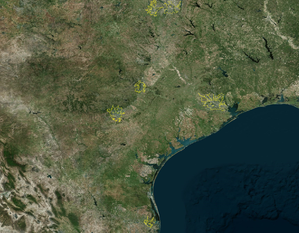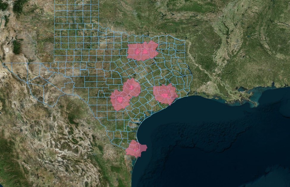 - AOIs: TXDoT - City Boundaries, TXDoT - Texas County Boundaries