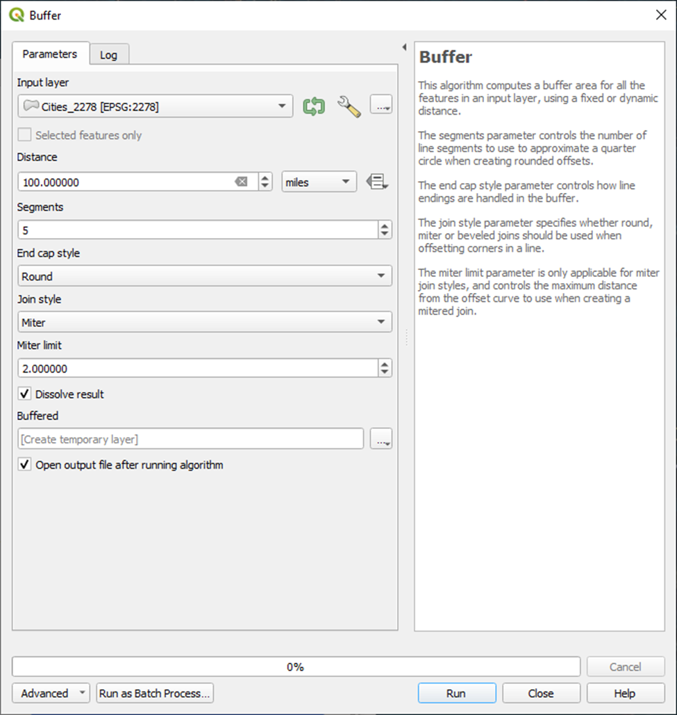 Next, let’s create our buffer zones around our cities to visualize those 100-mile buffers.