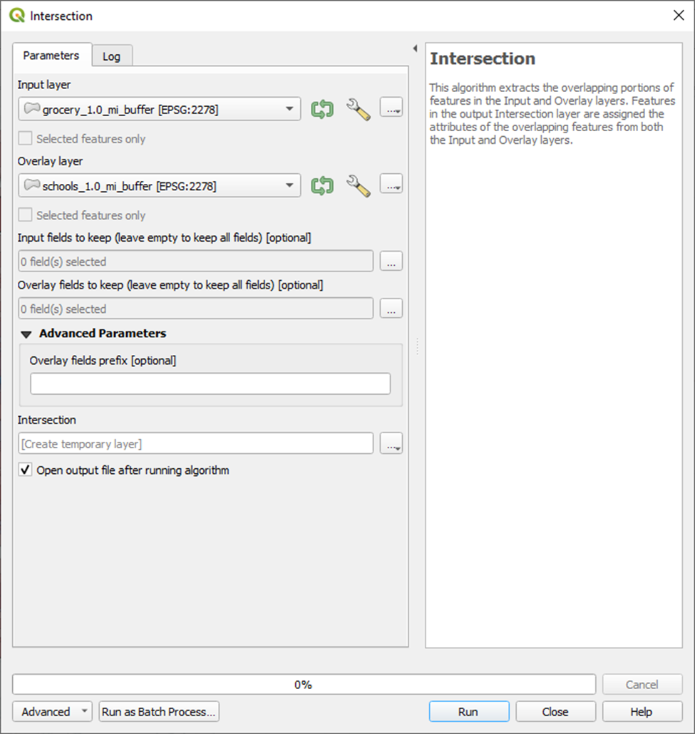 And here’s our result. These are all the areas that fall within 1 mile of an elementary school and a grocery store.