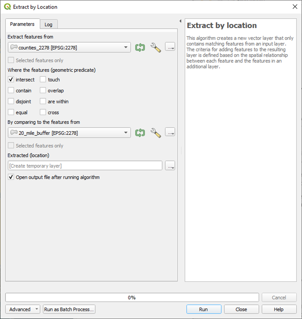 First we’ll export our cities layer to a local coordinate reference system (CRS). We’ll use EPSG: 2278 – NAD83 / Texas South Central (ftUS).
