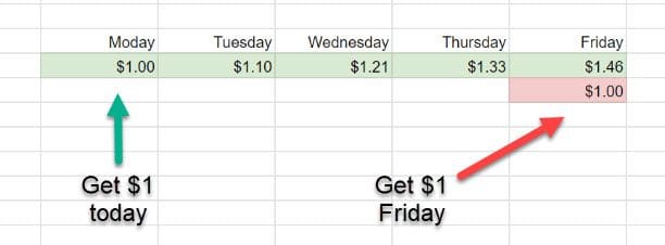 Let’s say your buddy Jerry owes you $1. Today is Monday. He says he can drop it off today or Friday.