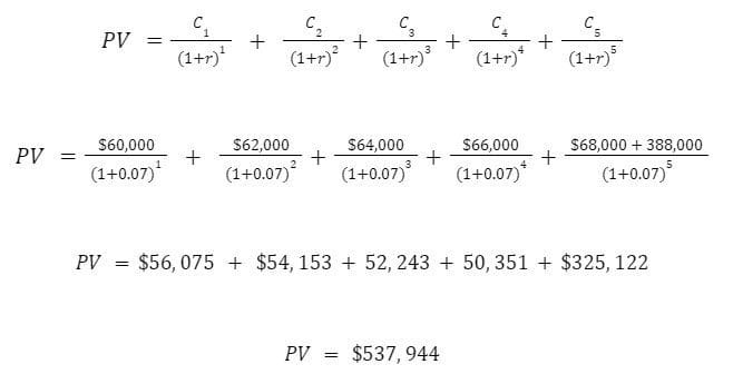 The present value of this investment’s cash flows across the next 5 years, given our alternative investment options, is $537,944.
